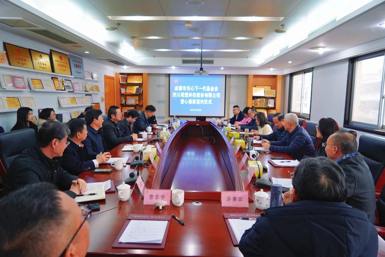 12月26日,成都市关心下一代基金会与四川观想科技股份有限公司爱心善款签约仪式暨捐赠仪式在市关工委会议室顺利举行。成都市关工委执行主任王忠林、常务副主任谢志迪出席仪式。基金会理事、监事及关爱基金成员单