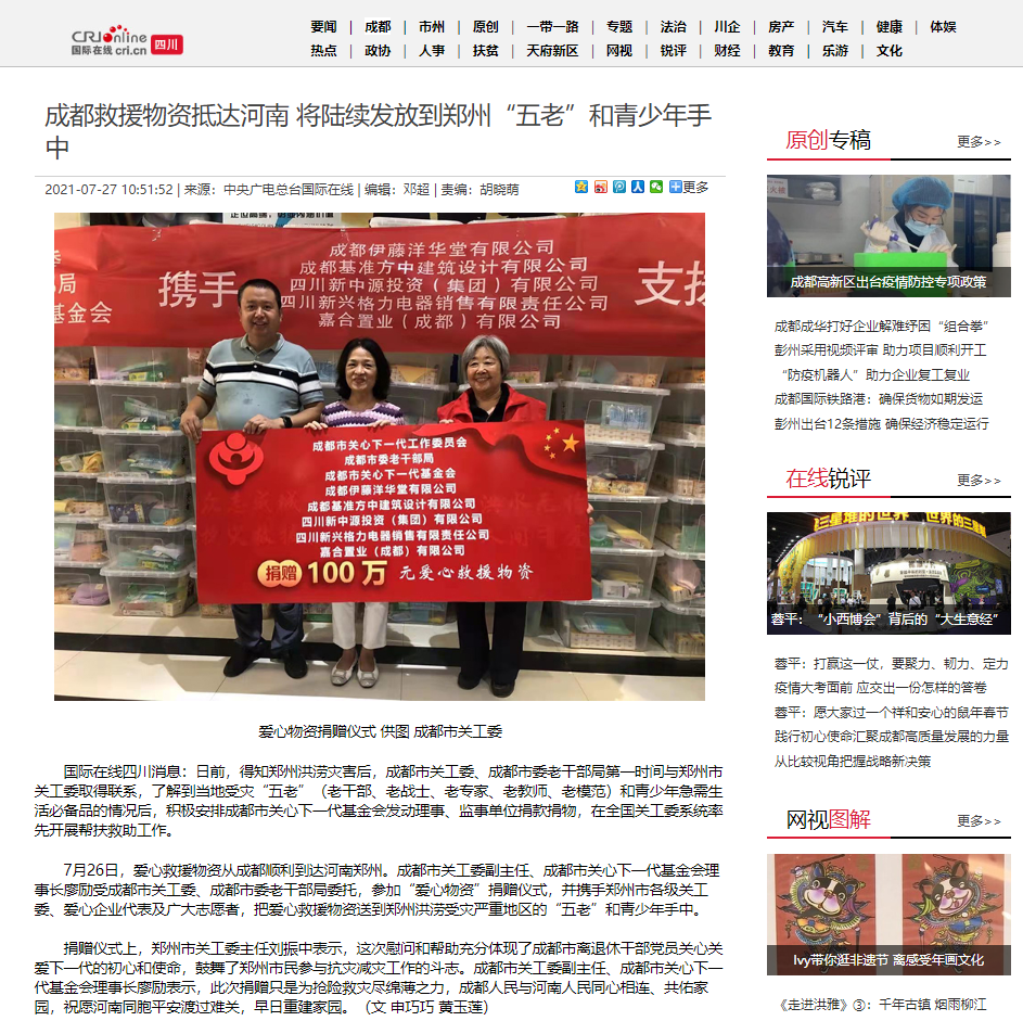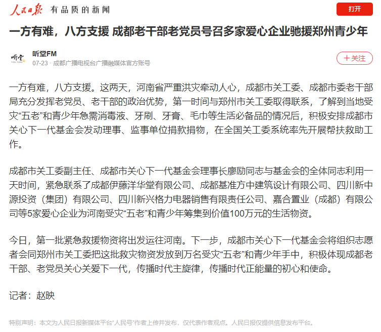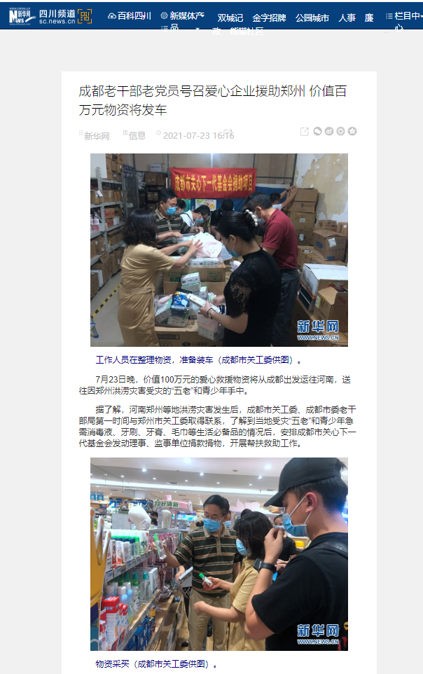 人民日报、中国火炬杂志、新华网、中央广电总台、四川观察、今日头条、郑州电视台、中国关工委、成都商报等20余家媒体对基金会2021年驰援河南郑州帮扶救援工作进行了宣传报道。