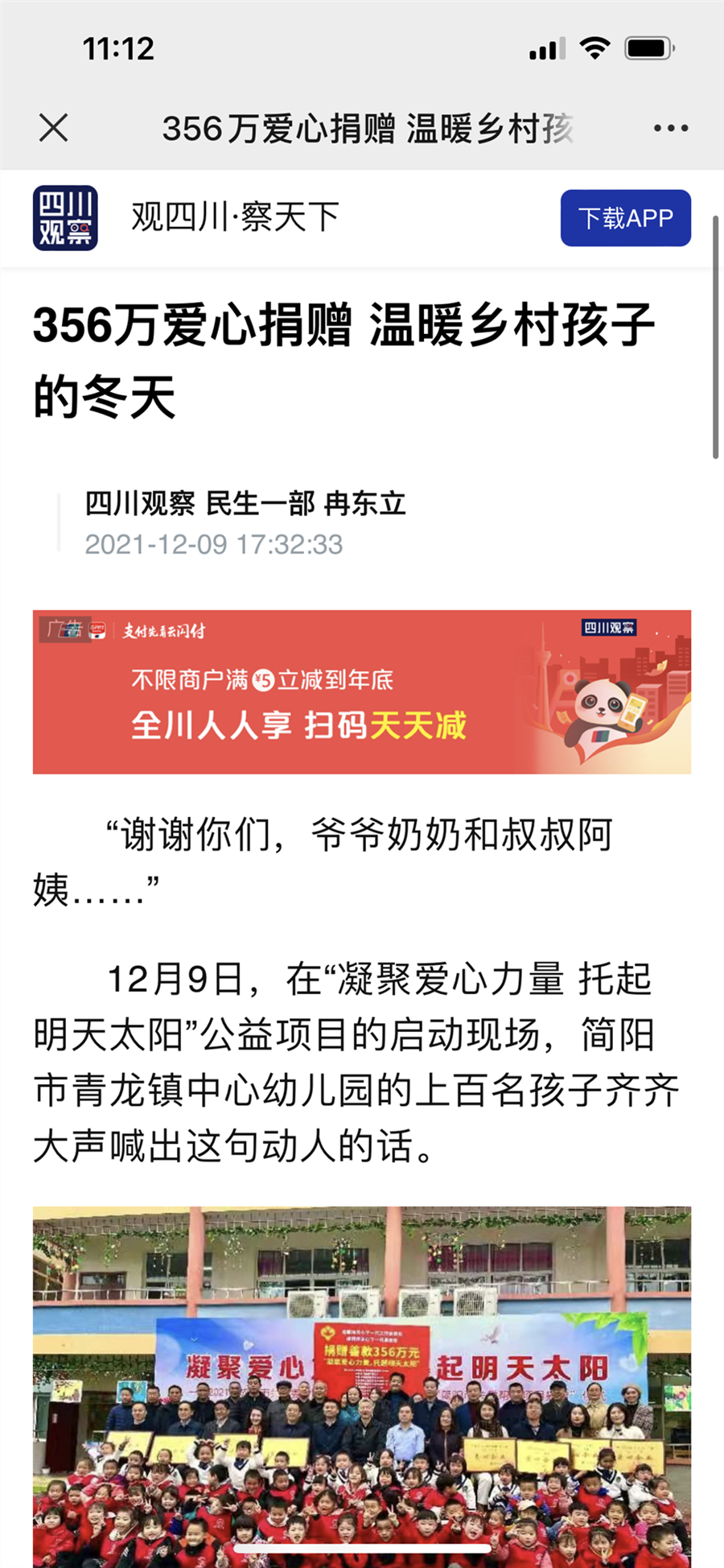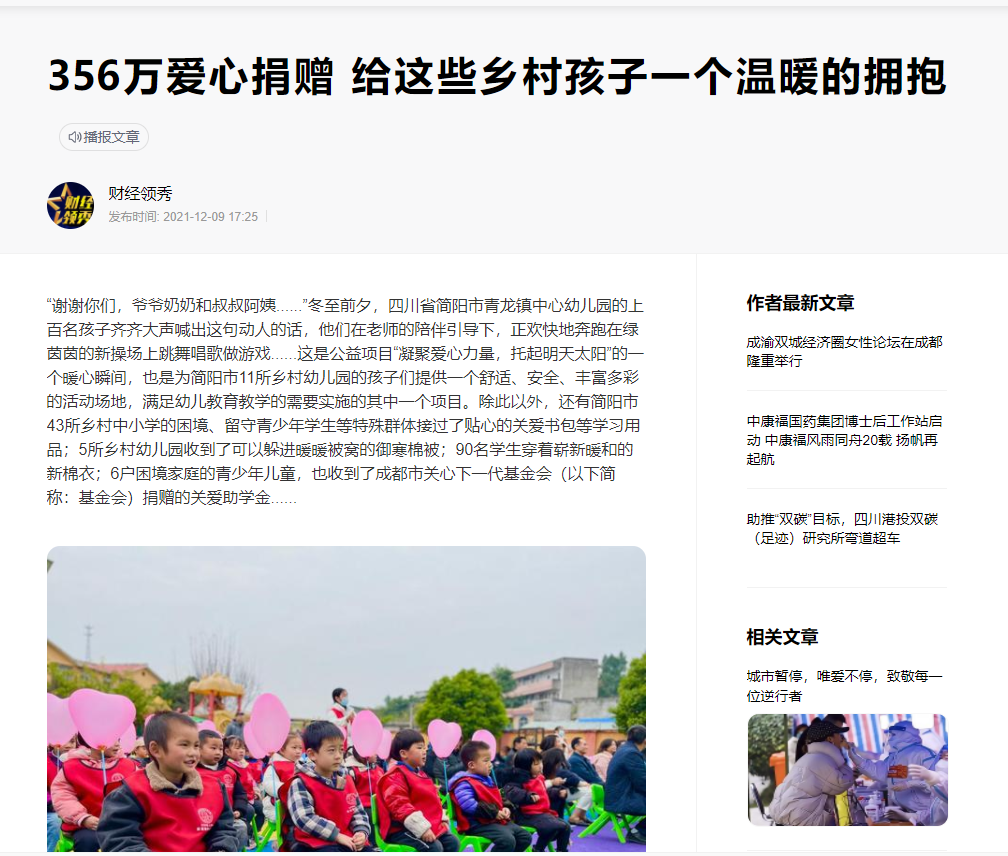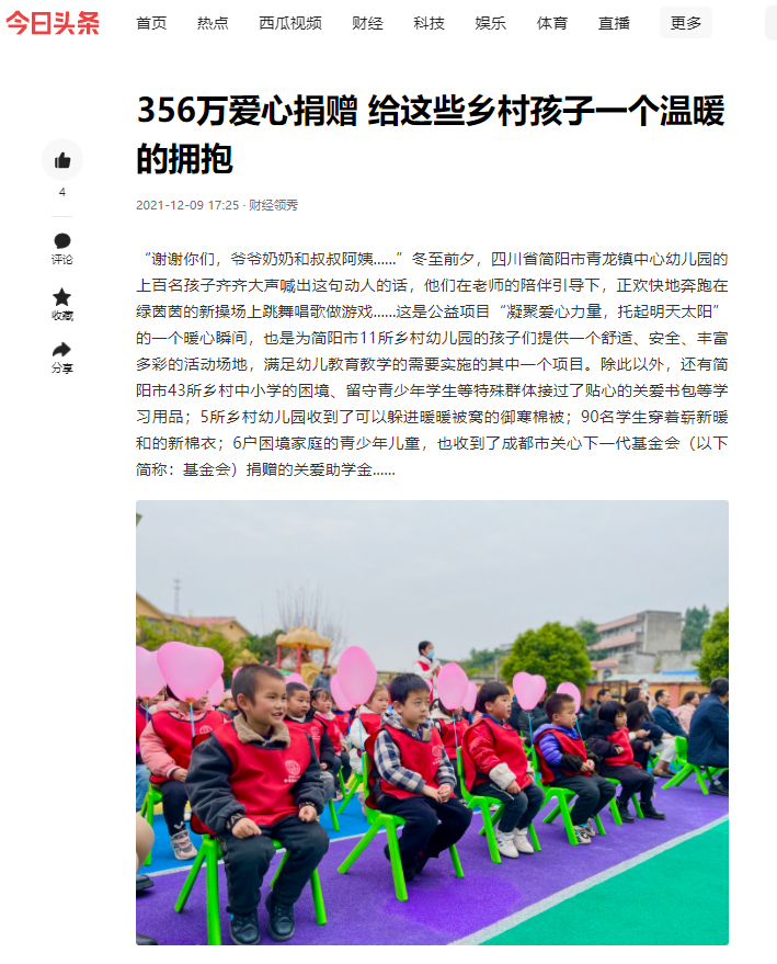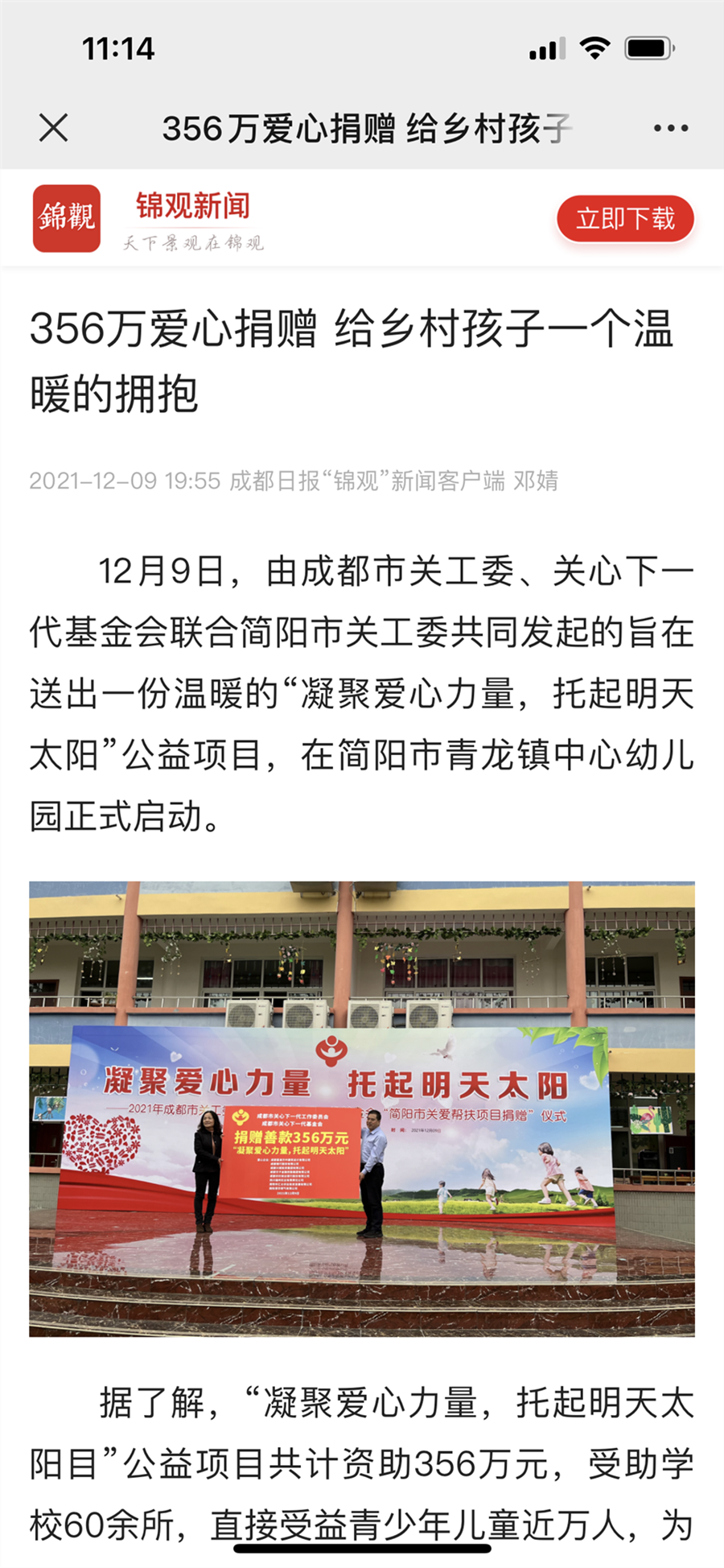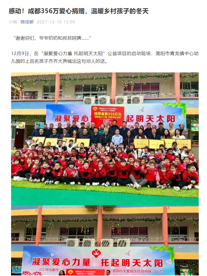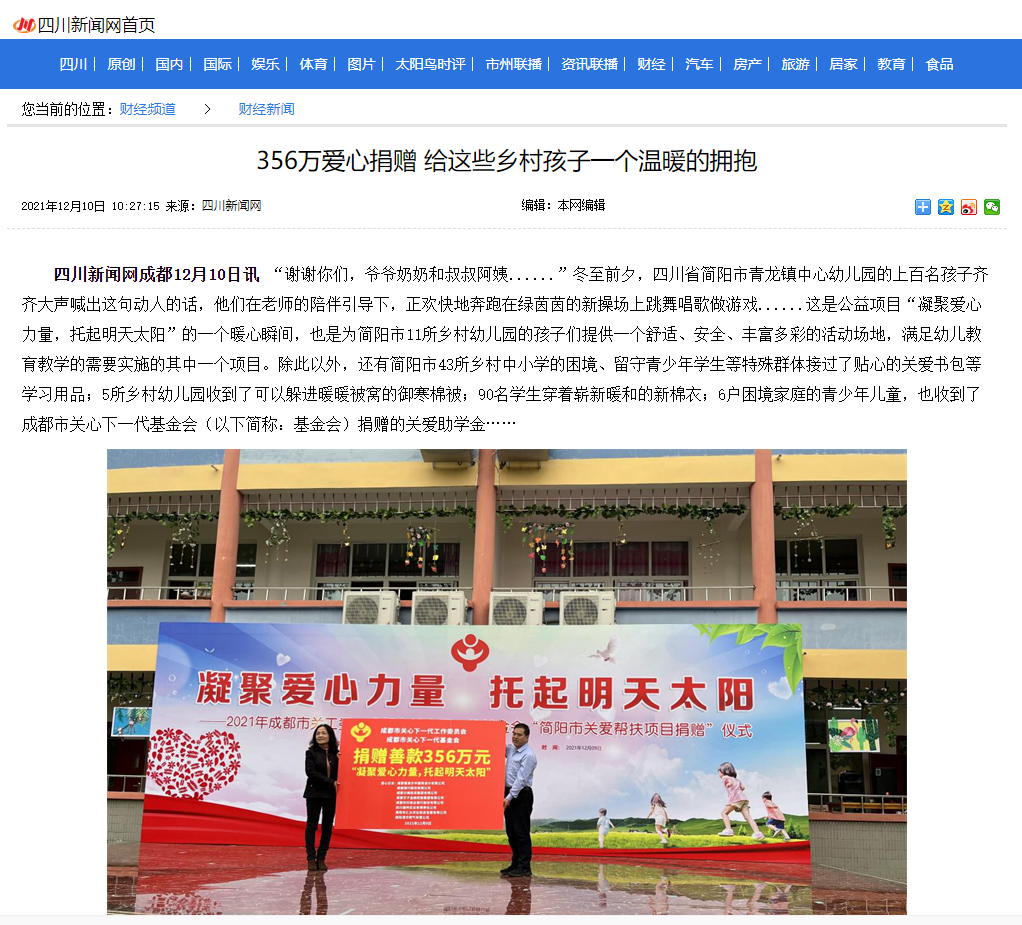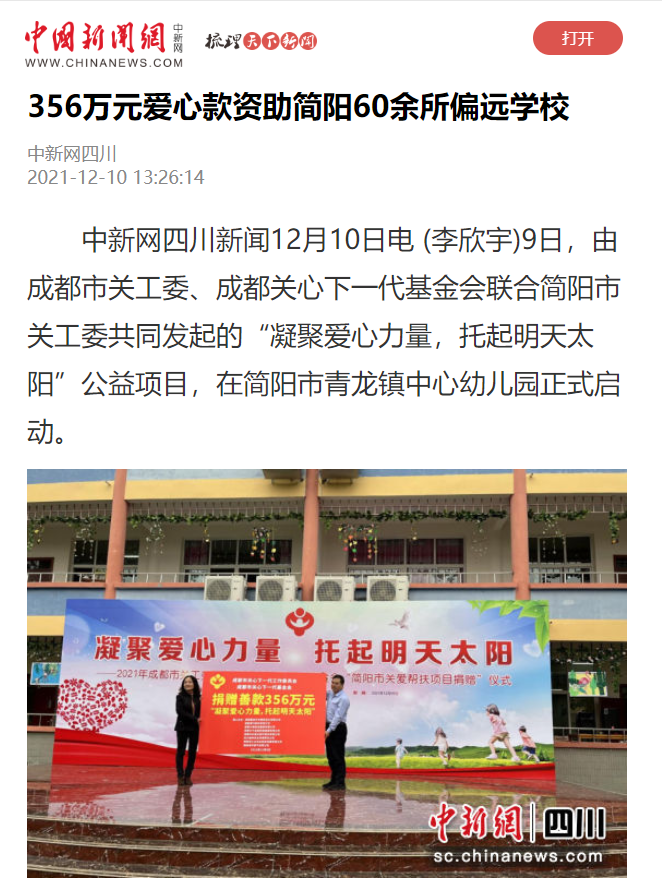 中国新闻网、四川新闻网、四川观察、成都日报、今日头条、微成都、百度等媒体对基金会2021年在简阳实施的“凝聚爱心力量 托起明天太阳”公益项目进行了宣传报道。