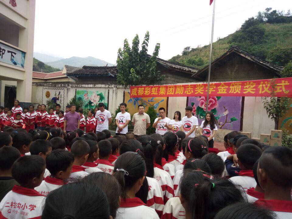 凉山州冕宁县沙坝镇二村沟第一小学地处大凉山地区,学生每日往返学校5-6小时,学习和生活条件异常艰苦。为鼓励他们坚持读书,成都市关心下一代基金会与成都彩虹电器集团公司,于2018年9月开展实施凉山州冕宁县沙坝镇二村沟第一小学贫困学生“彩虹励志奖学金”项目,为该校26名家庭贫困的优秀学子发放“彩虹励志奖学金”。