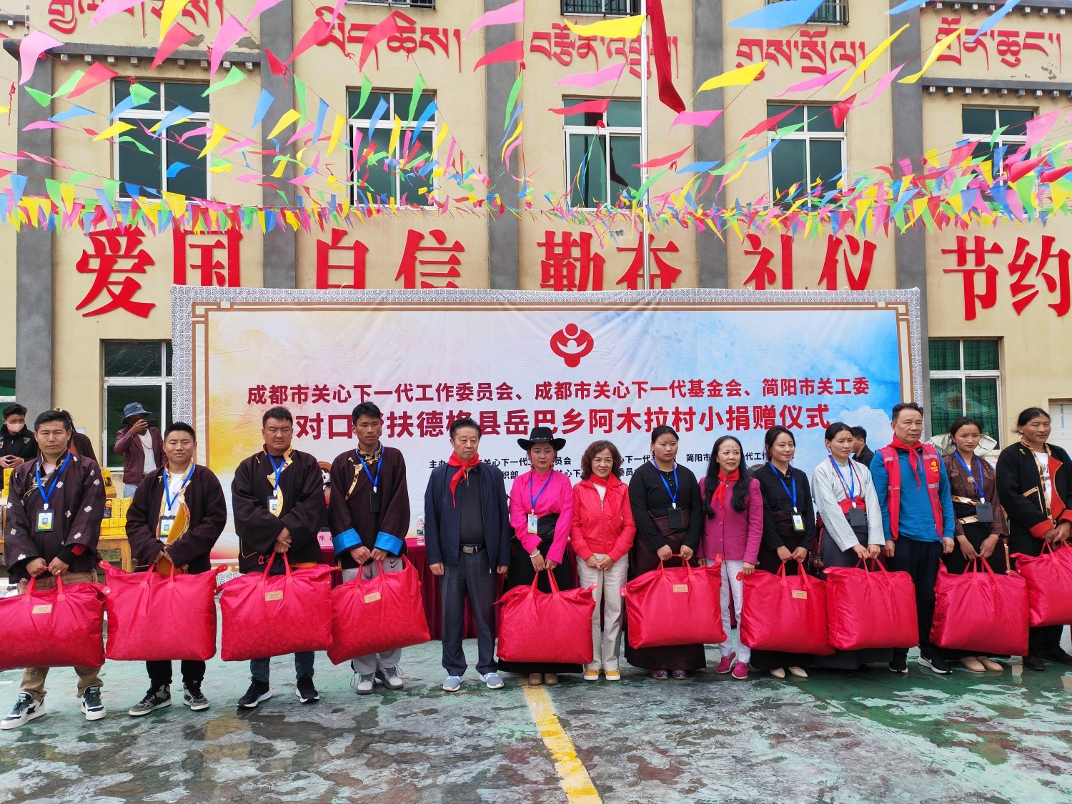 成都市关工委副主任、关心下一代基金会理事长廖励,简阳市关工委执行主任赵燕鹰,德格县委常委、组织部长彭廷君,德格县关工委执行主任泽登达吉致等相关领导及全校师生参加此次公益捐赠活动。