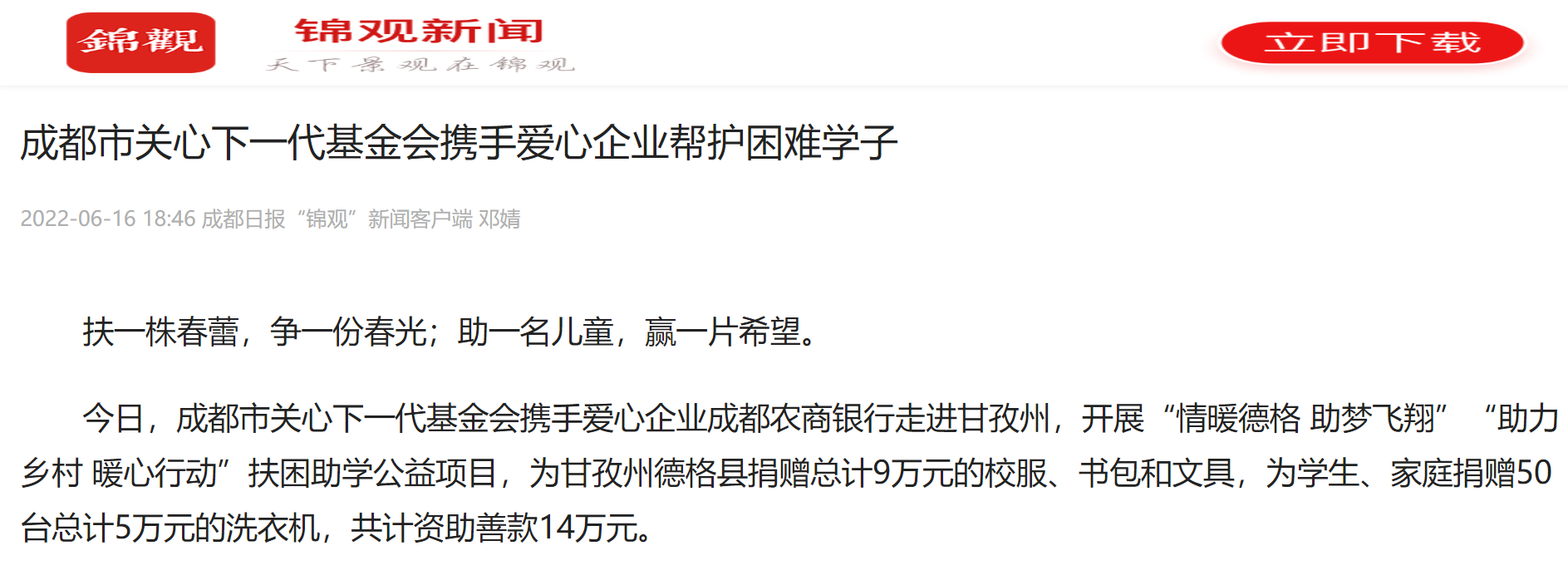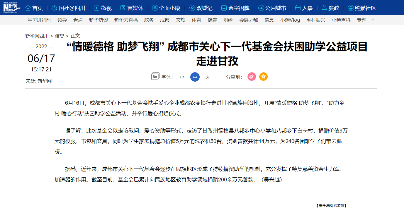 新华网、成都日报、今日头条对基金会实施的“情暖德格 助梦飞翔”等公益项目进行宣传报道